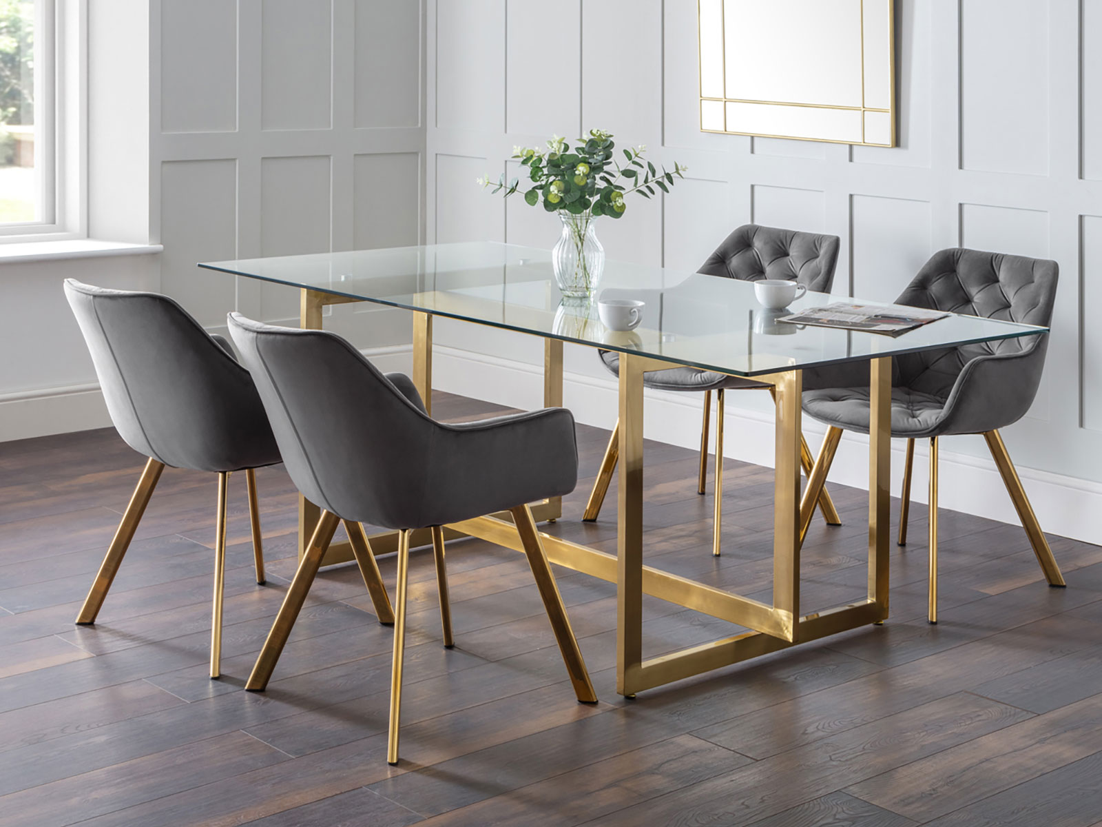 Designed with luxury in mind, Minori is a beautiful table that will take your dining experience to a whole new level. Featuring statement gold geometric legs and a sleek glass top, the Minori provides sophistication and luxury to any kitchen or dining area. Crafted from materials of the highest quality with sturdy construction, this piece will bring lifelong elegance to your home.