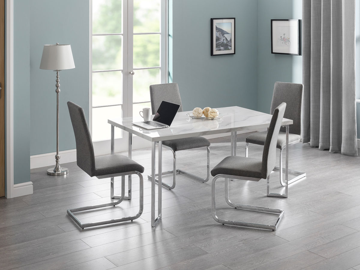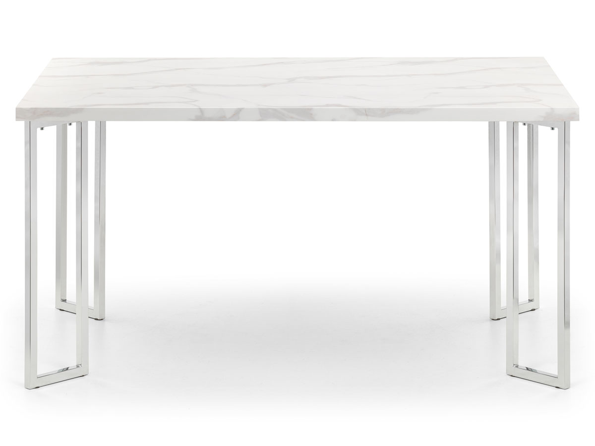 The Positano is crafed from a sleek marble effect top on a stainless steel frame. Featuring individual angled framed legs which give off a futeristic feel. It has a timeless Italian design that fits well with a wide range of décorative styles.