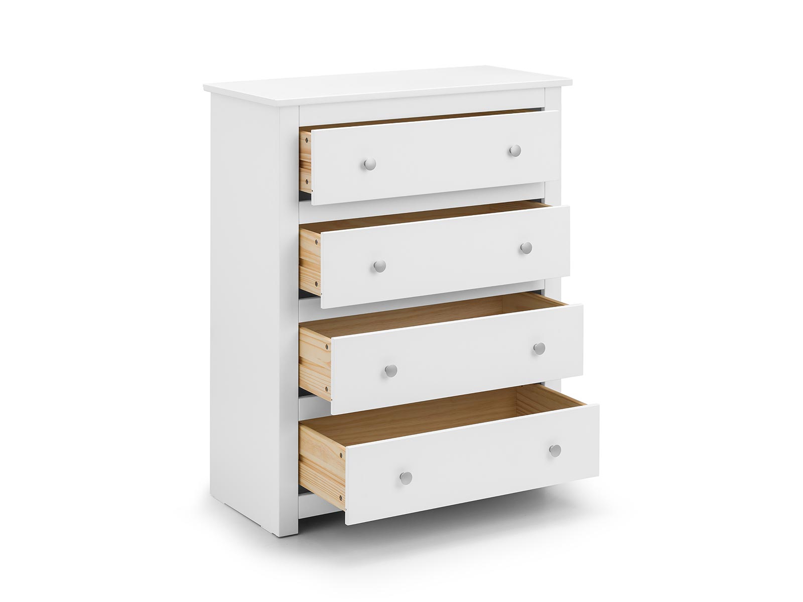 Boasting clean, simple lines the Radley 4 drawer chest is perfectly suited for both modern or traditional styles. Featuring four generously sized drawers to store away bulkier clothing. Finished in a surf white lacquer, with delicate silver handles, the Radley Bedroom Collection is perfect for adult and kids bedrooms.