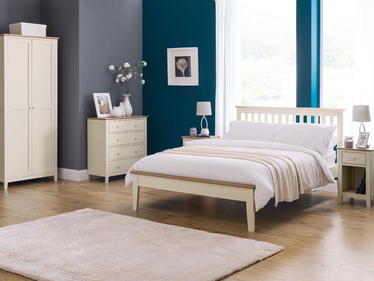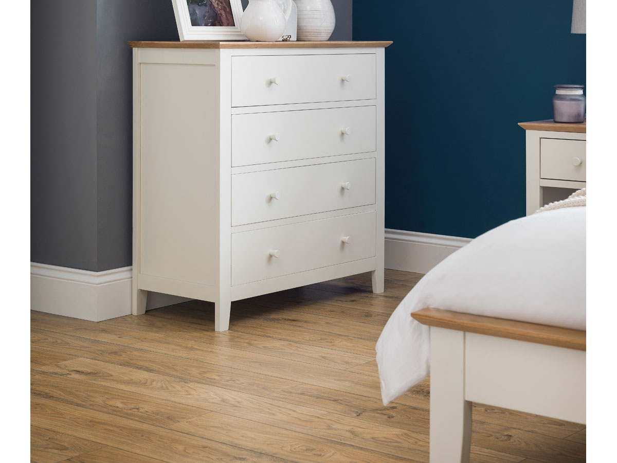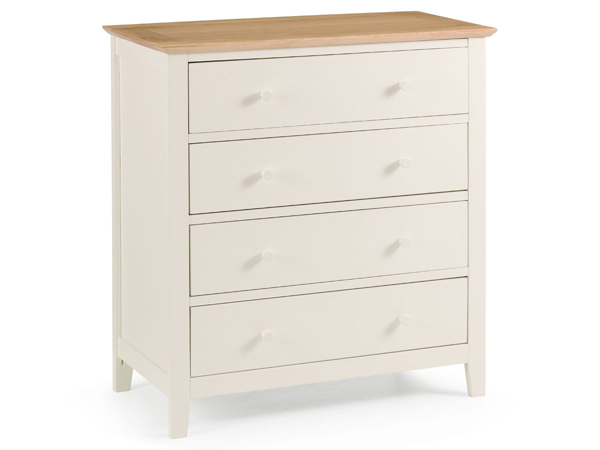 The Salerno Two-tone Ivory and Oak Four Drawer Chest is presented in the elegant Shaker style. Its clean, simple design and compact sizing offers timeless appeal and will fit well into any bedroom space. Finished in a beautiful painted ivory with high grade White Oak veneer top, Salerno combines quality materials with robust construction into a classic design. Part of the extensive Salerno range of Beds and Bedroom Furniture in Solid Oak, Two-tone Ivory/Oak and Ivory finishes.