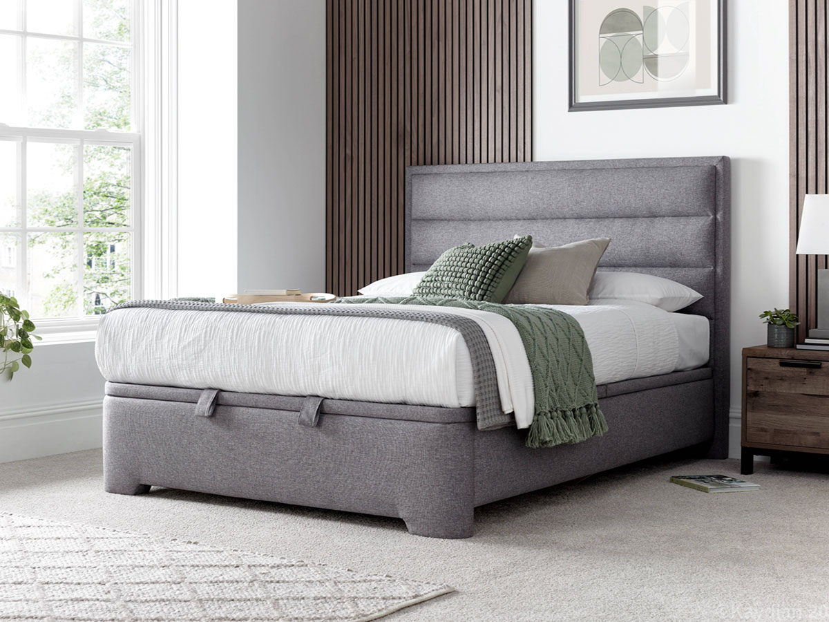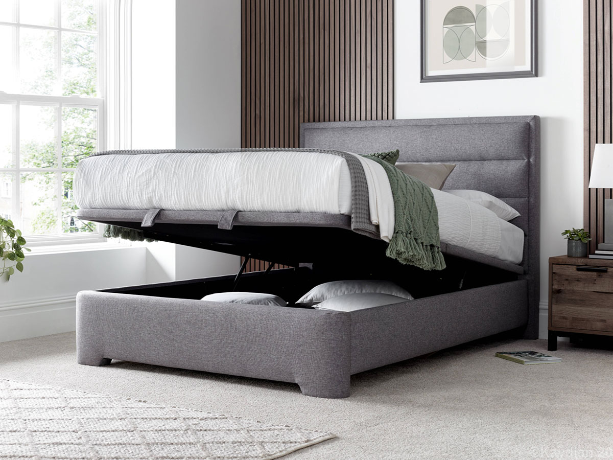 Upholstered in a soft shade of grey or slate fabric the Kirkby model is a versatile storage bed.