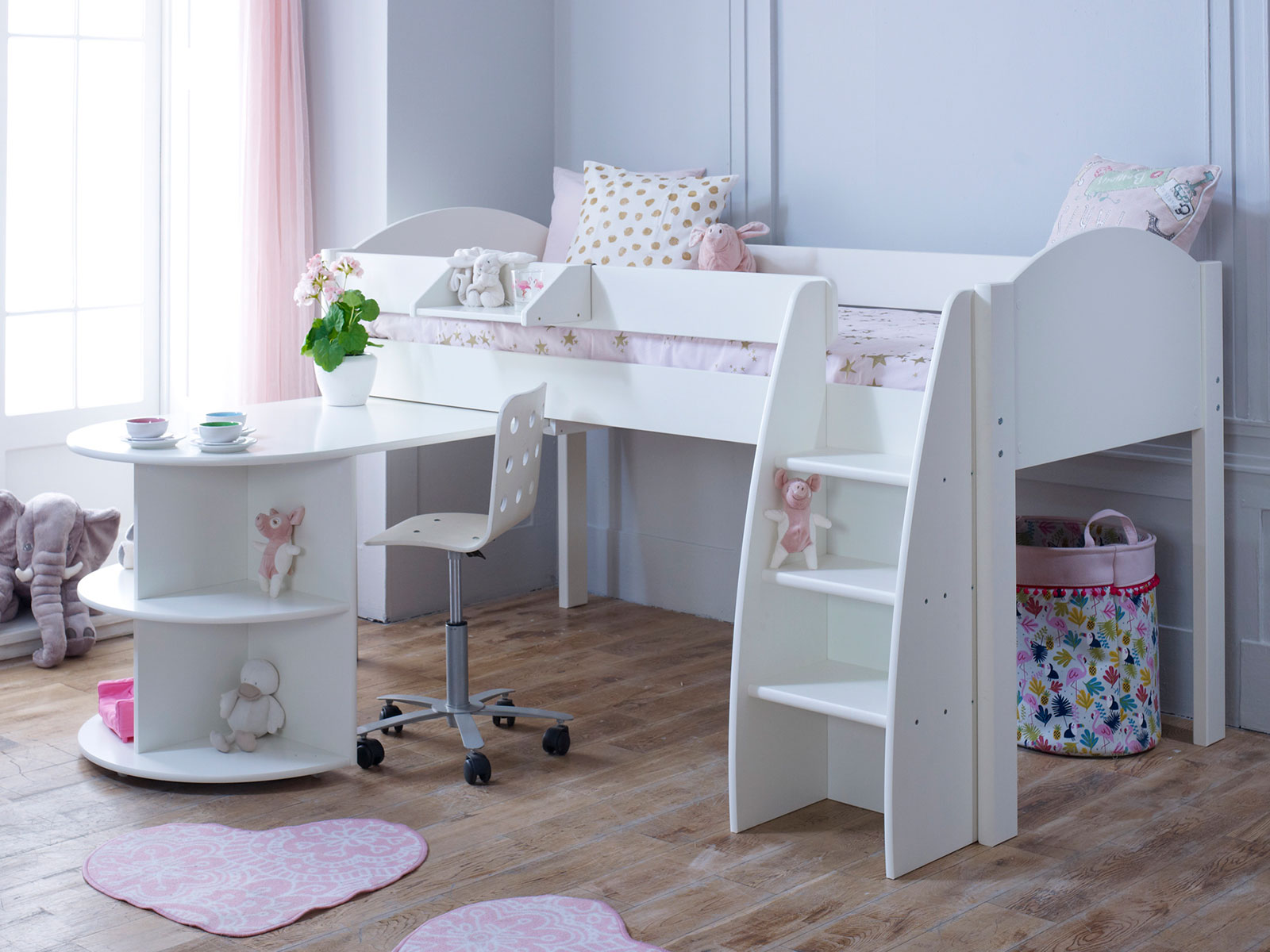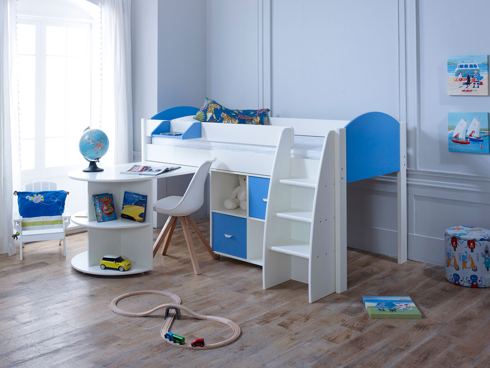 Available in 3 finishes, all white, white with lilac gable ends and cube unit doors or white with blue gable ends and cube unit doors this gorgeous combination offers storage as well as somewhere to sleep, study and play.