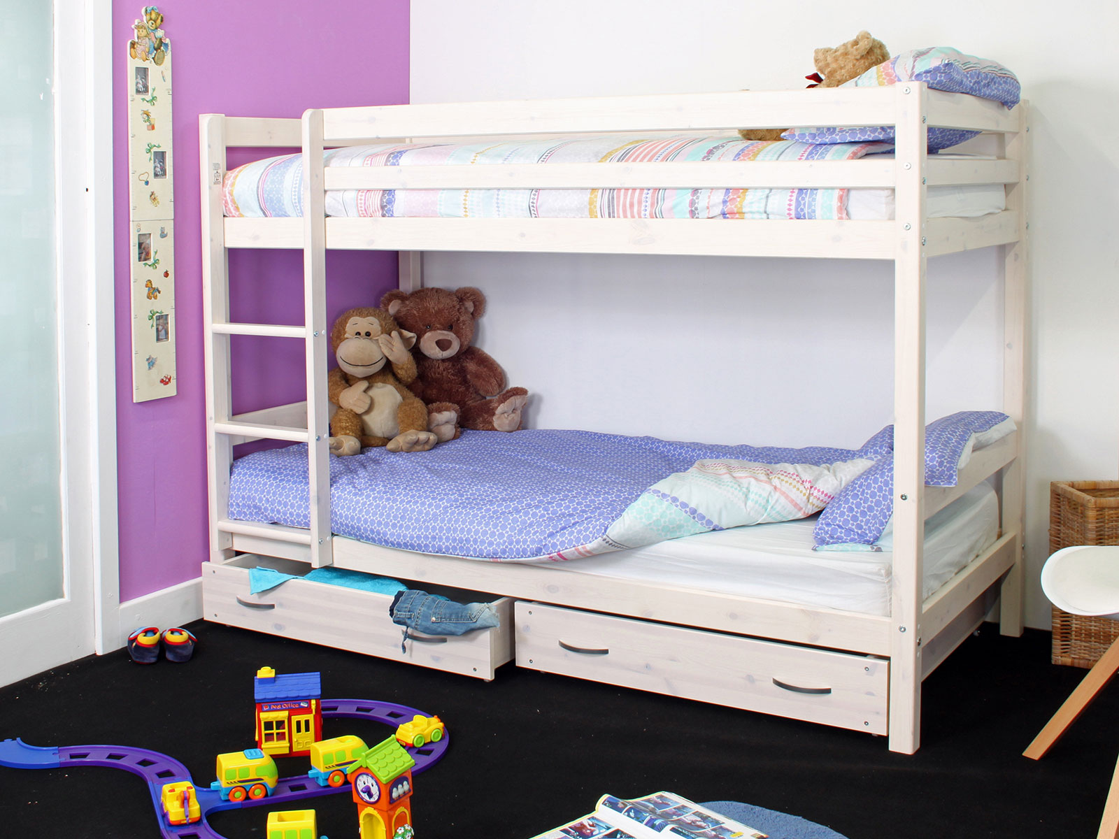 The Kids Avenue HIT 6 solid pine bunkbed has a lovely whitewash finish and comes complete with a pair of underbed drawers.