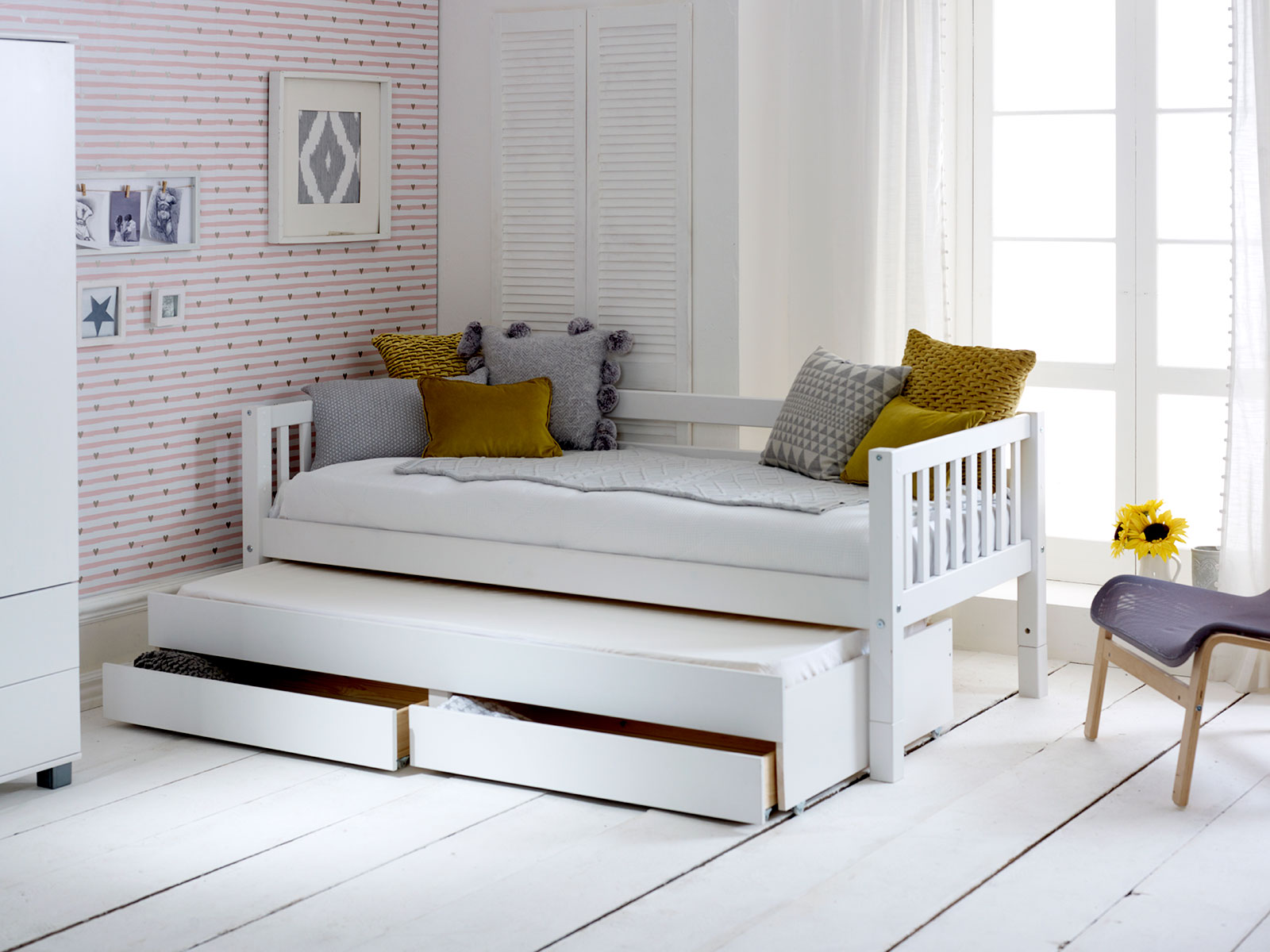 As well as a head and foot board the bed benefits from a back rail creating the stylish day bed look. Under the bed is a pull out trundle bed with 2 storage drawers below that. This white bed is available with a choice of 5 gable ends: flat white, grey, rose, slatted and tongue & groove.