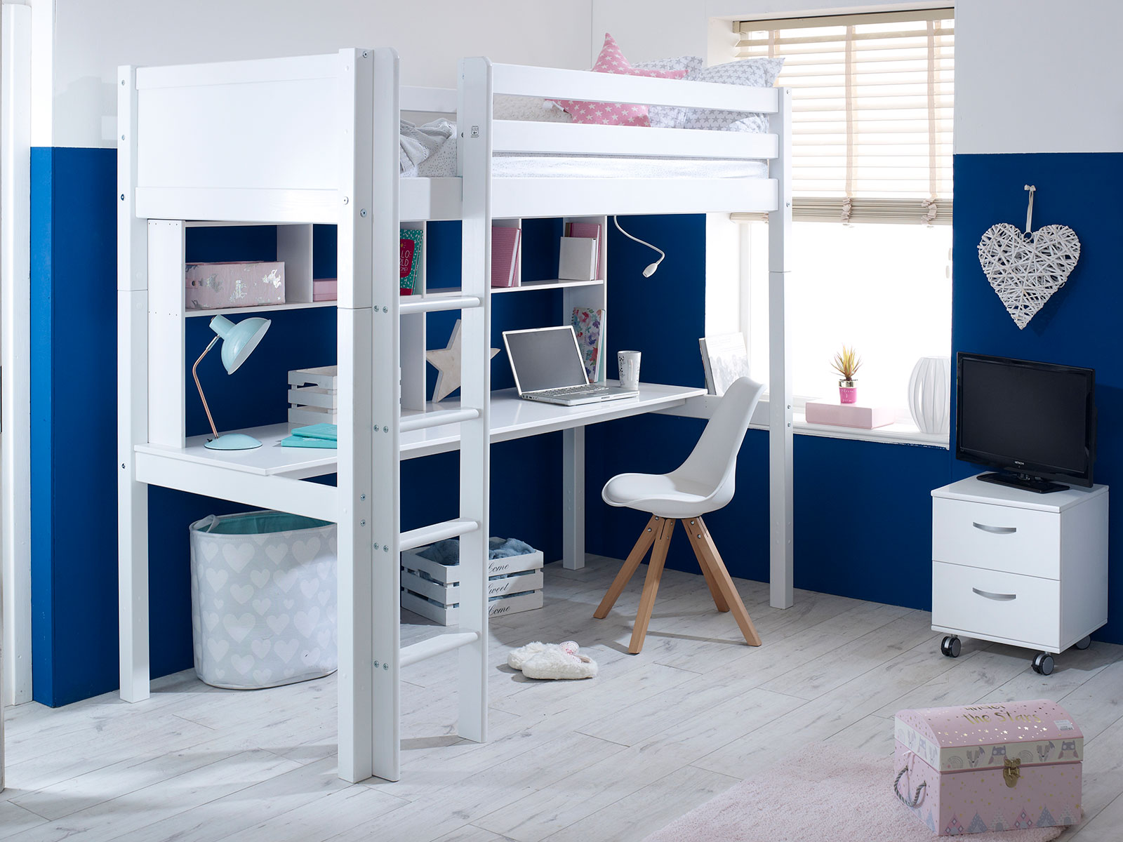 The space beneath the raised sleeping platform has been utilised to create a wonderful study area. The all white frame can be enhanced with a variety of gable ends to suit yThe Kids Avenue decor, available in flat white, grey, rose, slatted and tongue & groove.