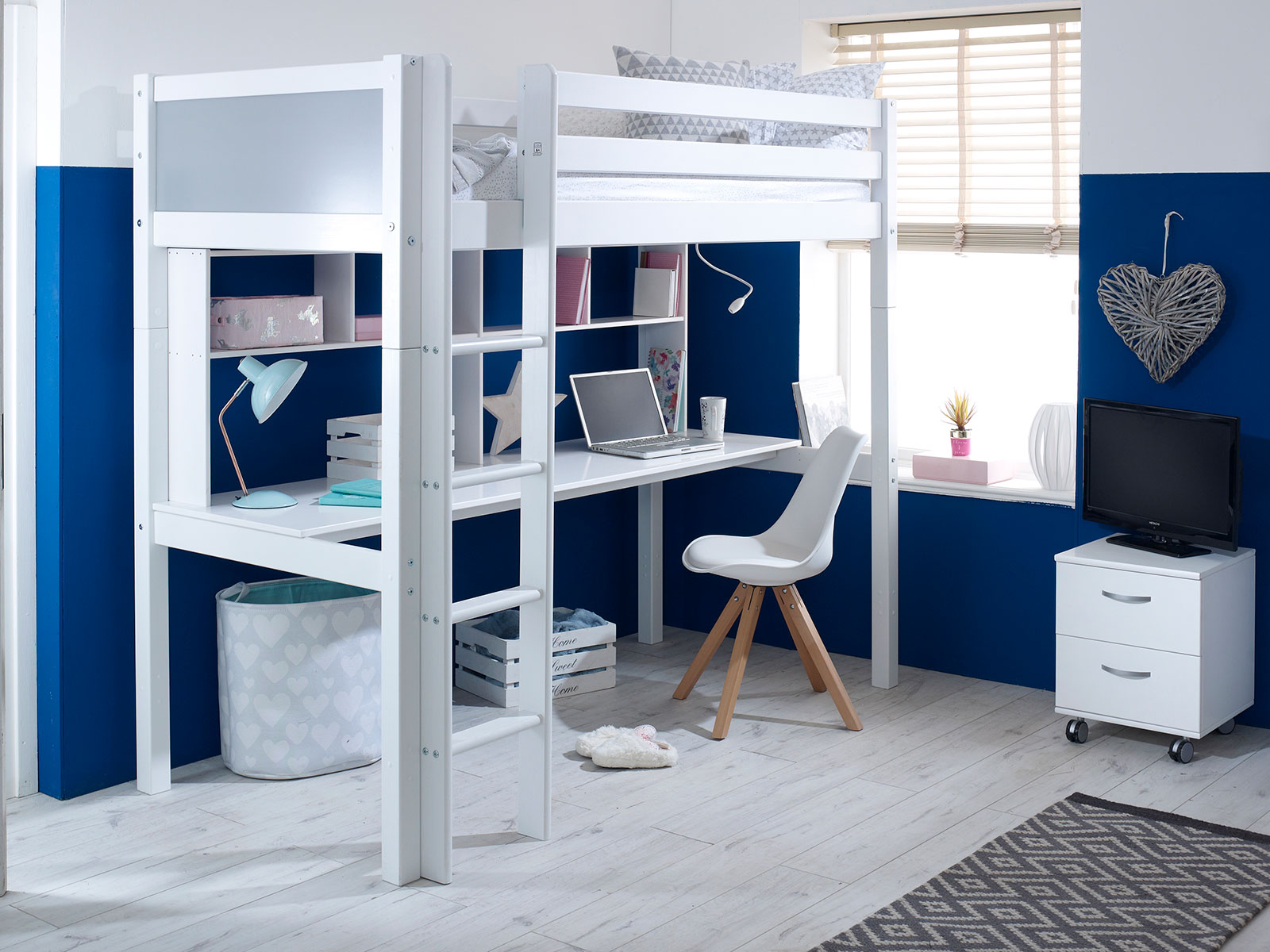 The space beneath the raised sleeping platform has been utilised to create a wonderful study area. The all white frame can be enhanced with a variety of gable ends to suit yThe Kids Avenue decor, available in flat white, grey, rose, slatted and tongue & groove.