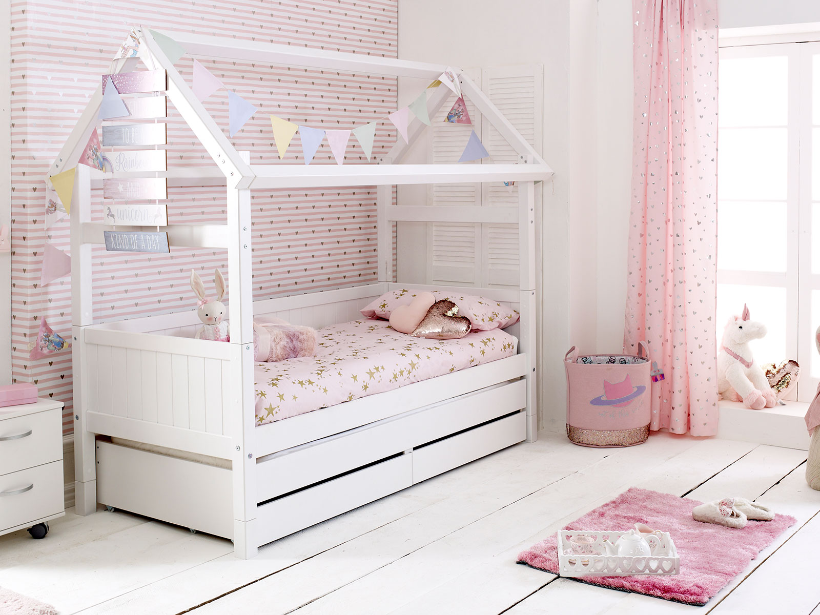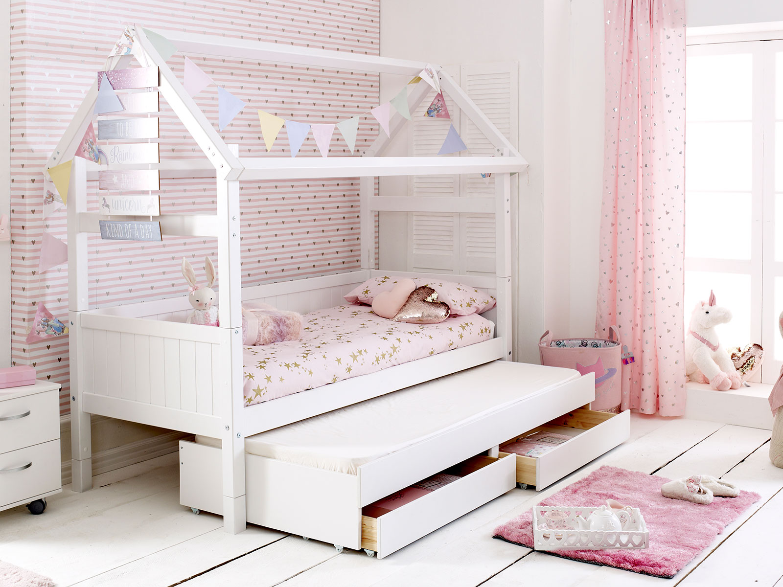 This beautiful Nordic playhouse 2 bed in white features of a pair of underbed drawers and a trundle bed and is 16cm taller than the Nordic Playhouse 1.