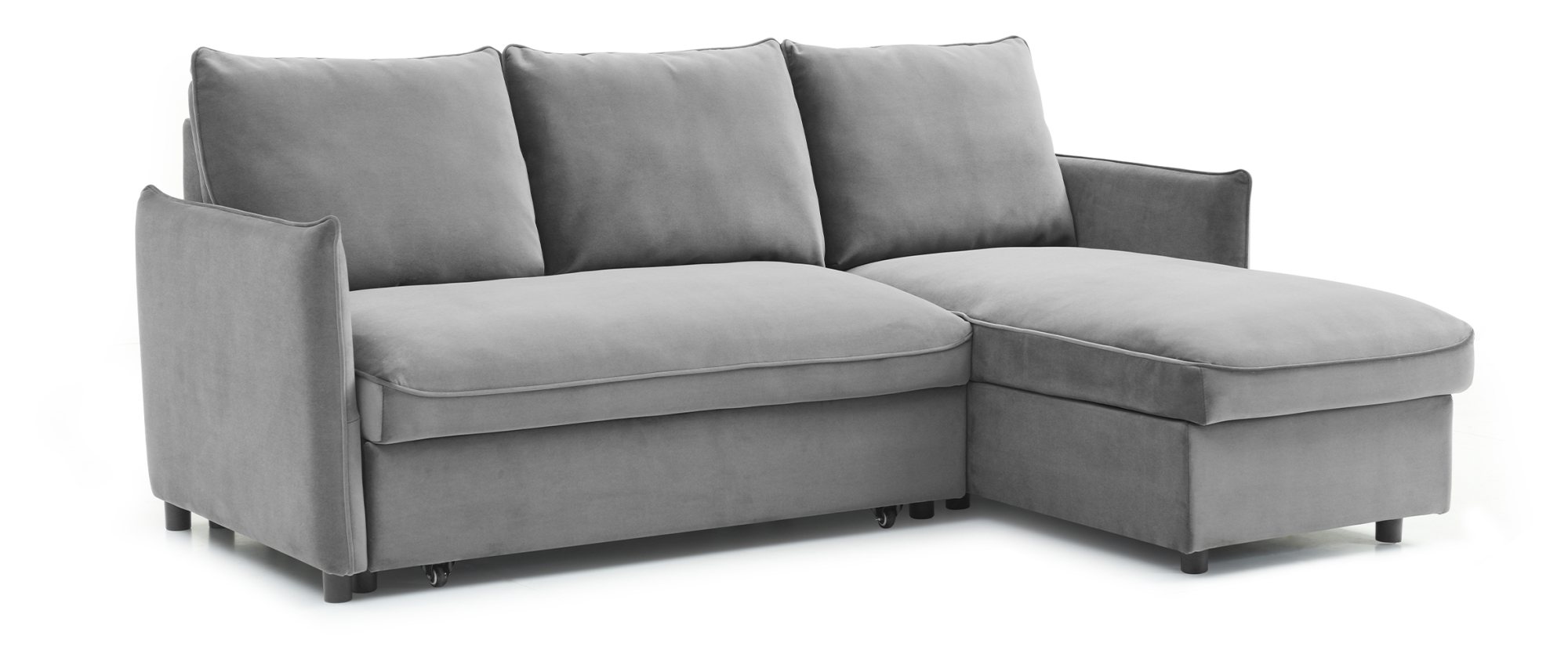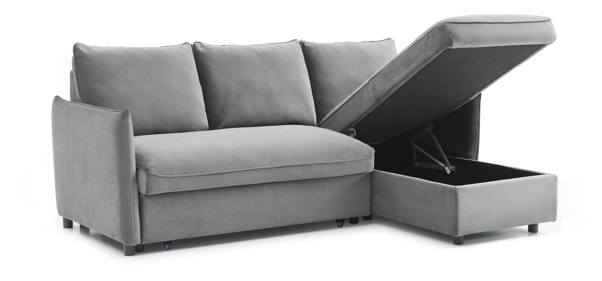 The Blaire corner sofabed features a deeply padded foam seat, and click clack back with large sleeping area. Available as a 3 Seater Corner sofabed with additional storage under the chaise, or as a 2 Seater pop-up. Blaire comes in a new Grey Boucle, Olive Green Velvet and Orange Velvet.
