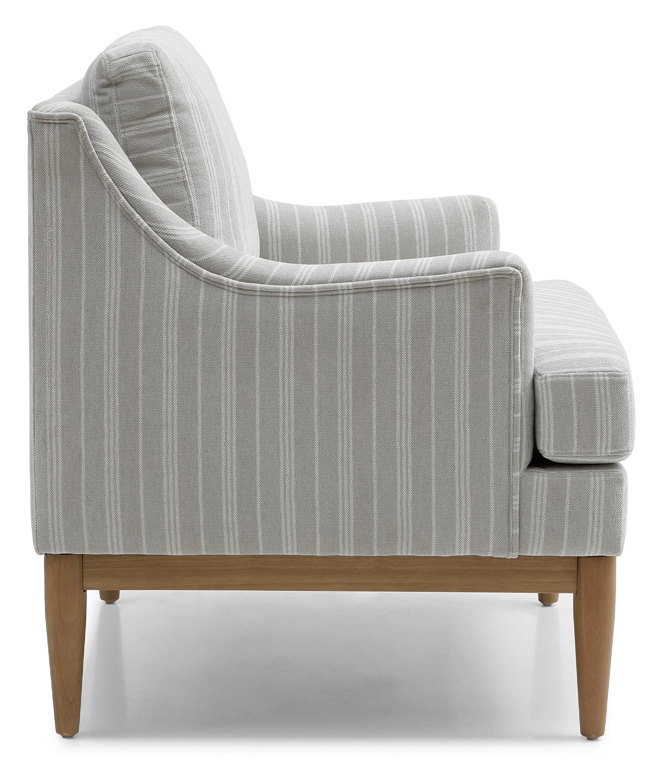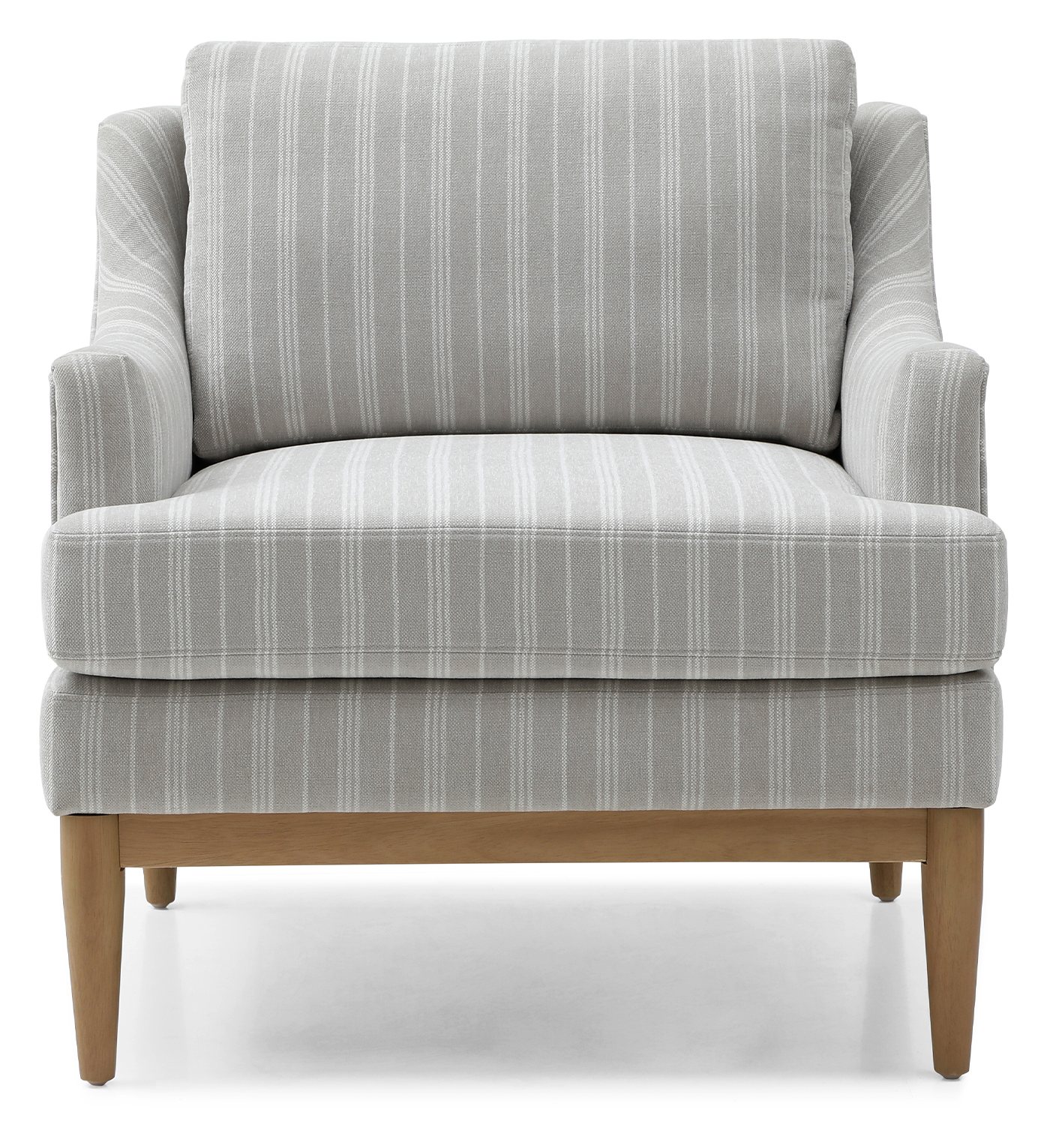 The new Briar accent chair features elegant sloped arms for comfort, a sprung seat and deeply padded back cushion. Available in 2 fabrics; a stripe chenille in natural with natural wood legs and a distressed chenille in olive with dark wood legs.