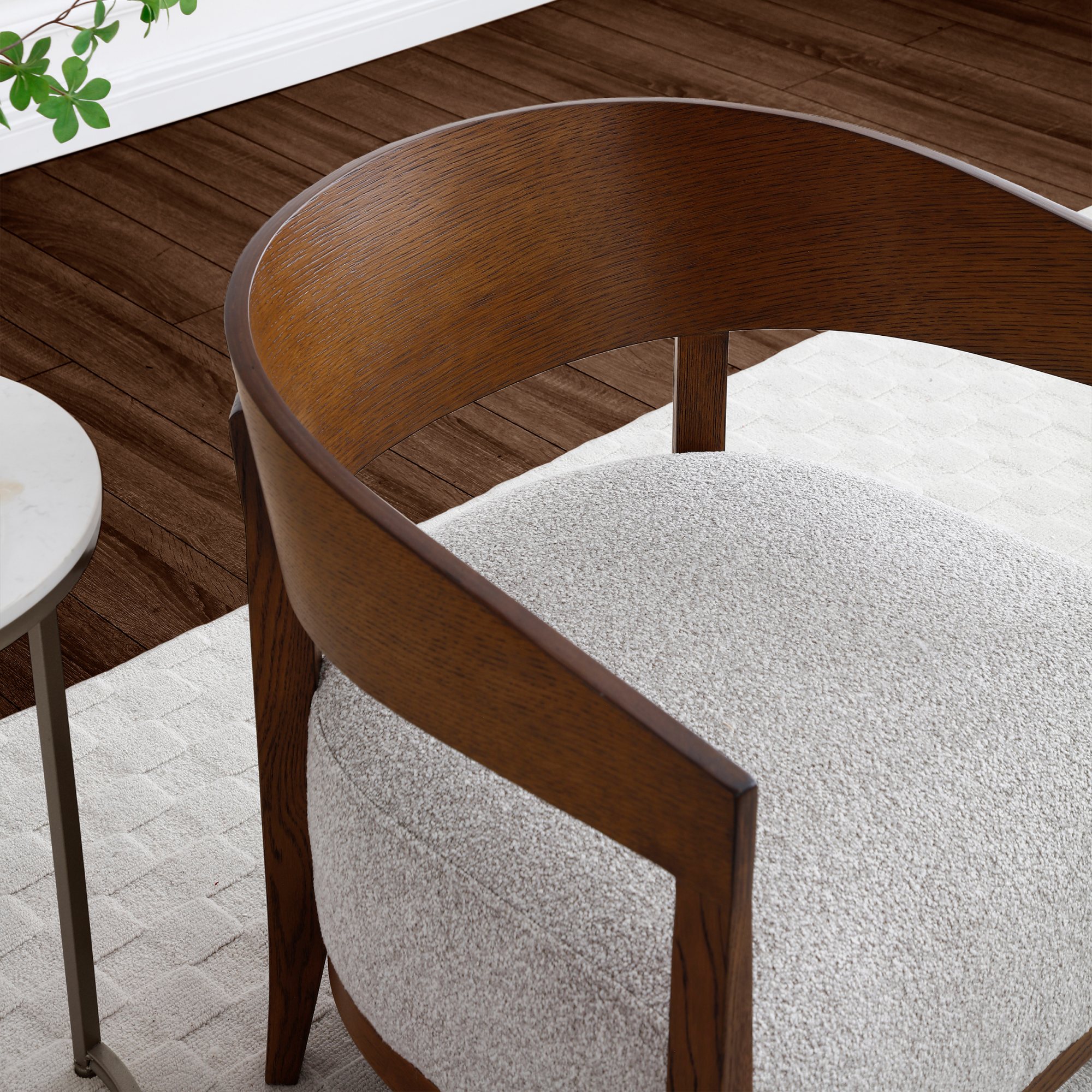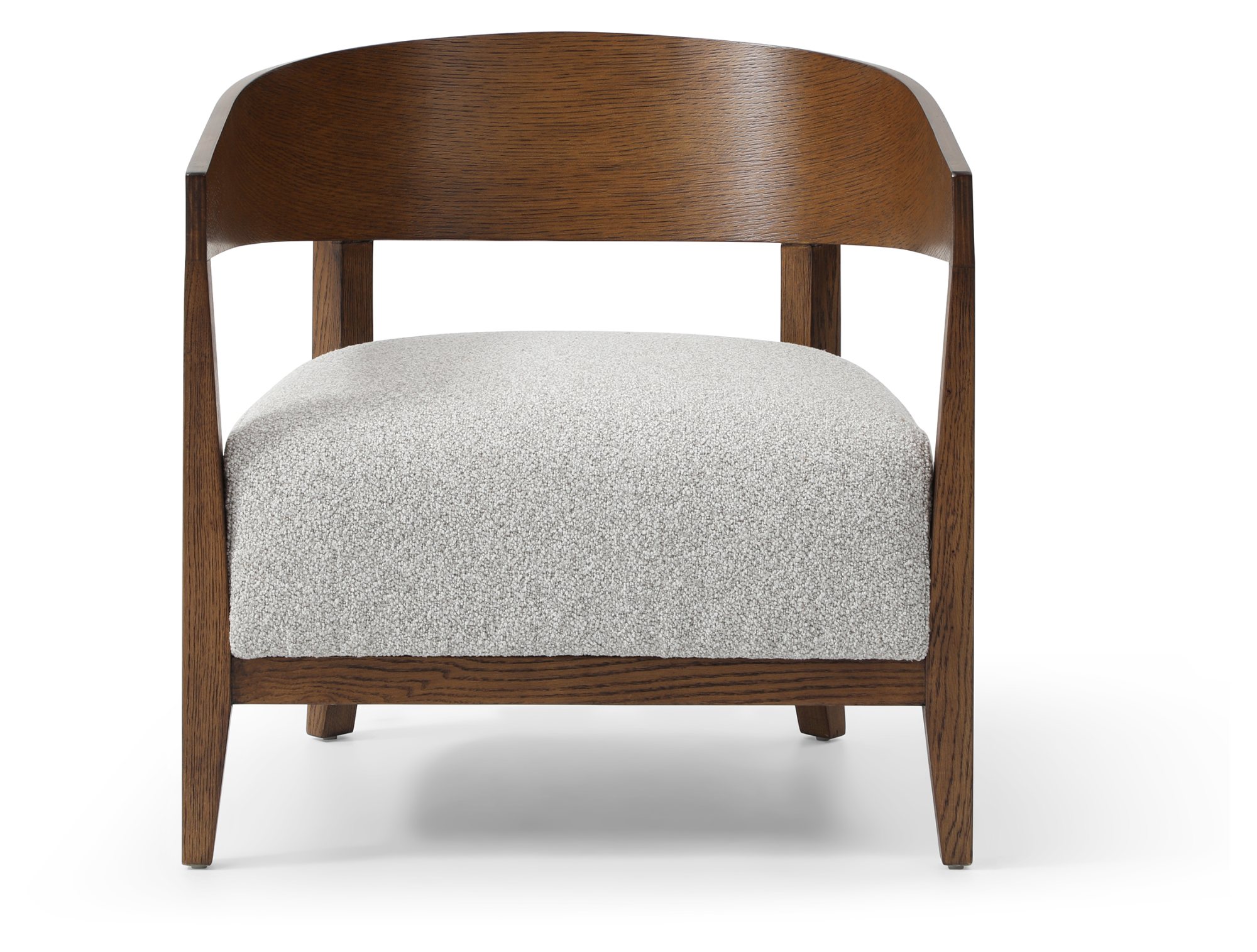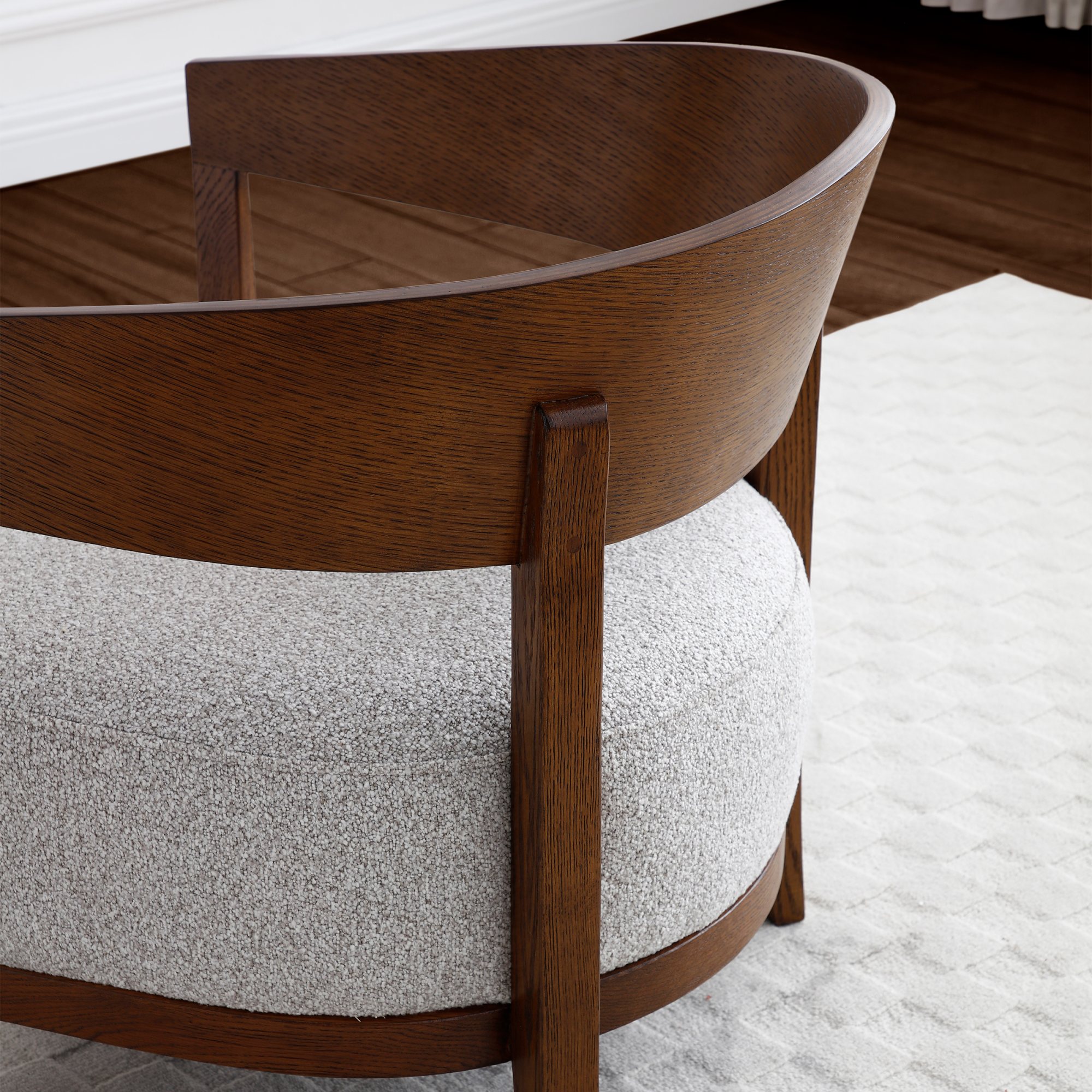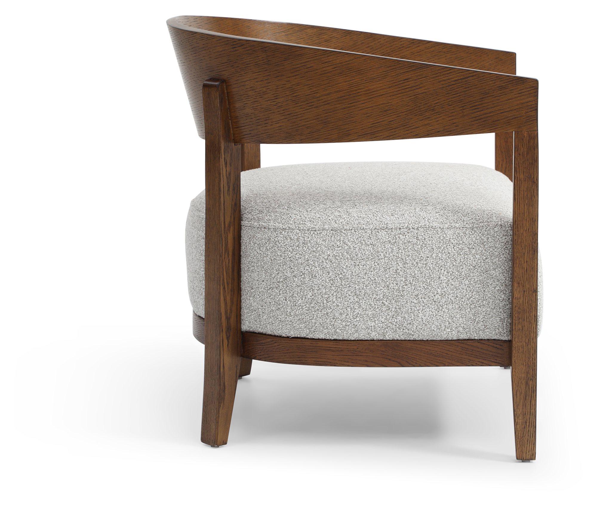 Reuben Chair features a curved, dark oak wooden frame with a deep padded seat, upholstered in a soft boucle fabric in grey. Comes fully assembled.