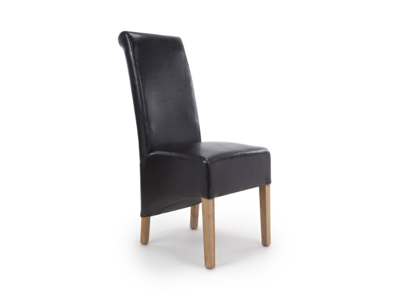 A classic roll back design dining chair, in timeless black bonded leather. Sprung and belted seat. Supplied with natural rubberwood legs. Fully assembled. Sold in boxes of 2.