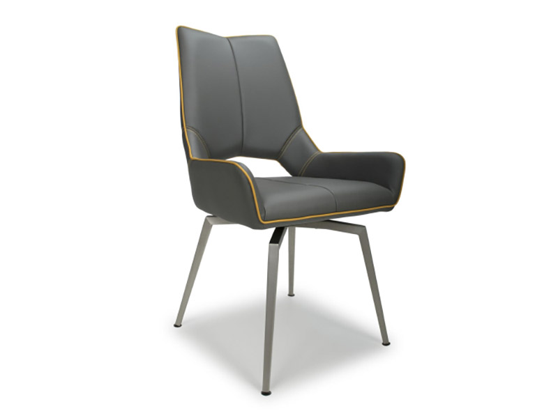 An ultra-modern angled dining chair, upholstered in graphite grey leather effect. The seat smoothly swivels before gently returning to a central position. Supplied with stainless steel tripod style legs. Assembly required. Sold in boxes of 2.