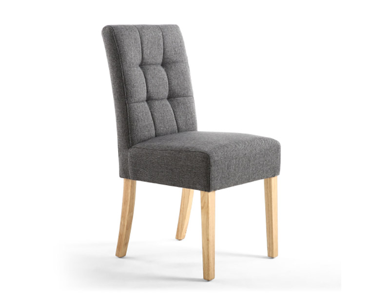 A modern deep seated dining chair with stitched waffle detailing on the back, upholstered in steel grey linen effect fabric. Sprung and belted seat. Available in natural rubberwood legs. Assembly required. Sold in boxes of 2.