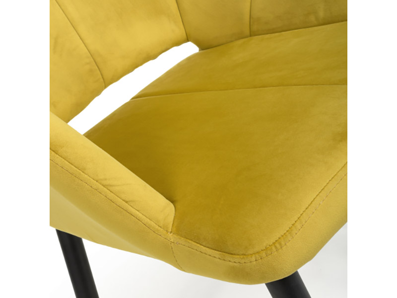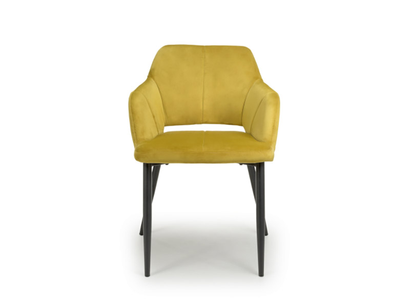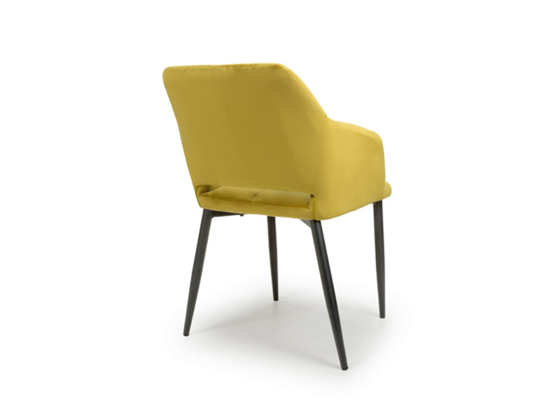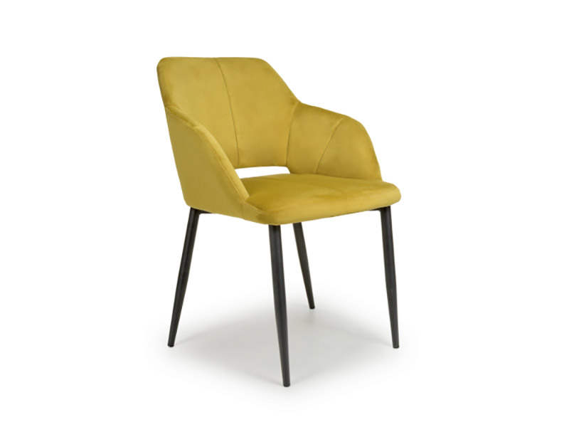 This contemporary angular dining chair comes upholstered in a striking lime gold brushed velvet. Features a stylish gap between the back and seat. Vertical stitching runs down the centre. Supplied with black metal legs. Assembly required. Sold in boxes of 2.