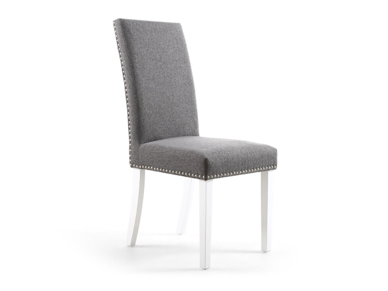 A timeless dining chair enhanced by attractive stud detailing around the edges, upholstered in steel grey linen effect fabric. Sprung and belted seat. Available in white rubberwood legs. Assembly required. Sold in boxes of 2.
