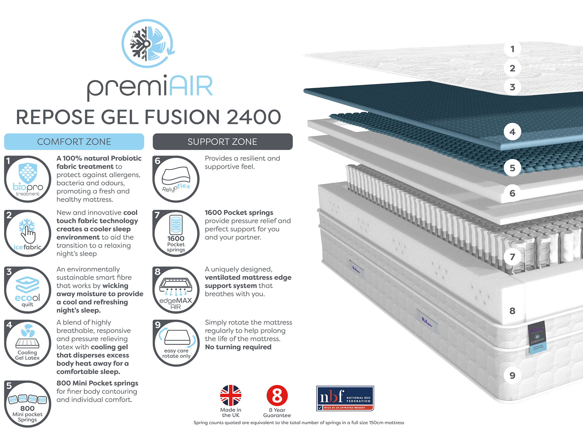 With a technical blend of Gel Latex, Icefabric and eCool technologies, Relyon have made it even easier for you and your loved ones to enjoy the perfect night’s sleep without it becoming a painful experience.