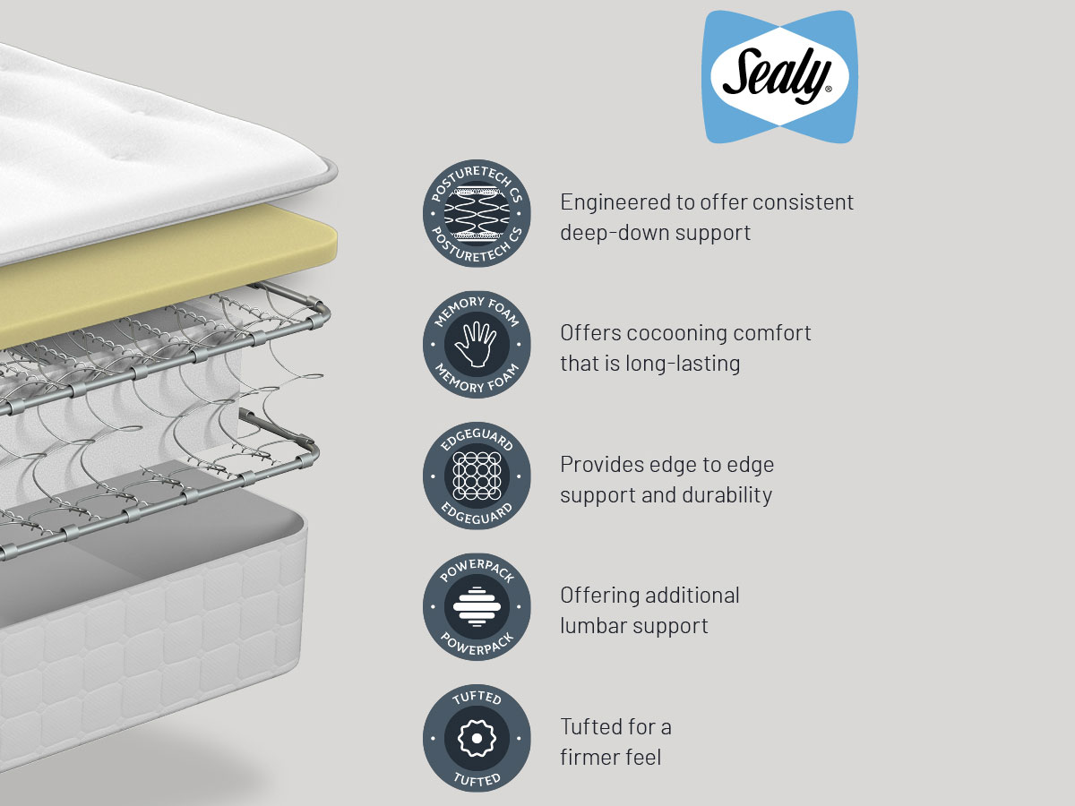 Sealy’s bespoke PostureTech spring system is at the heart of the mattress, designed to provide long lasting and deep-down support. The springs