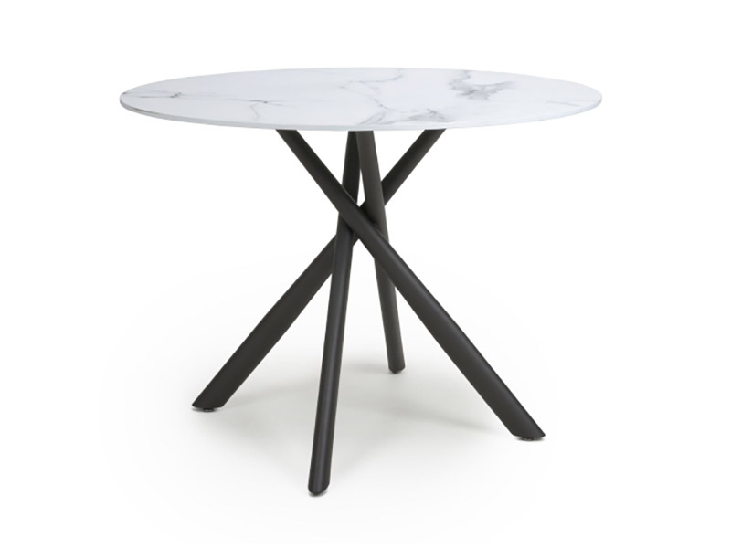 This sleek and contemporary round dining table combines a tempered glass top with a stylish overlapping metal leg frame. The 1m marble effect white table top comfortably seats 4 people. Black powder coated metal cross-frame legs. Assembly required. Sold individually.