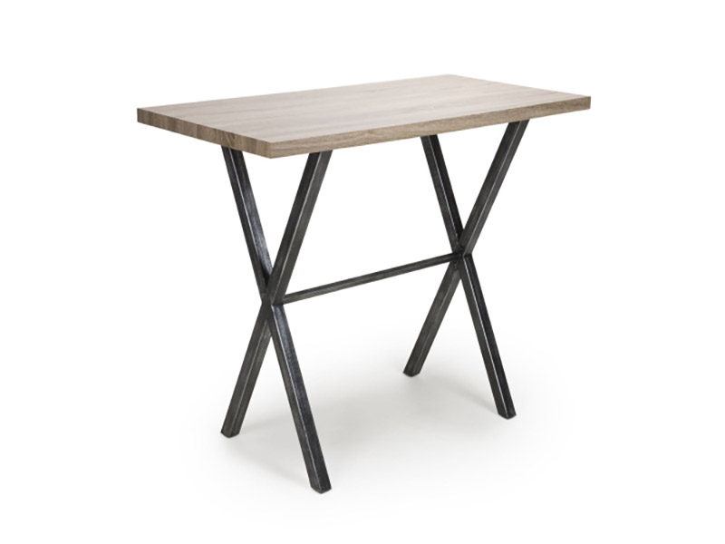 This 1.2m bar table brings industrial chic to the kitchen. es an with distinctive metal frame. The rectangular oak effect top is the ideal height to combine with stools. Antique painted black cross frame metal legs complete the rustic look. Assembly required. Sold individually.