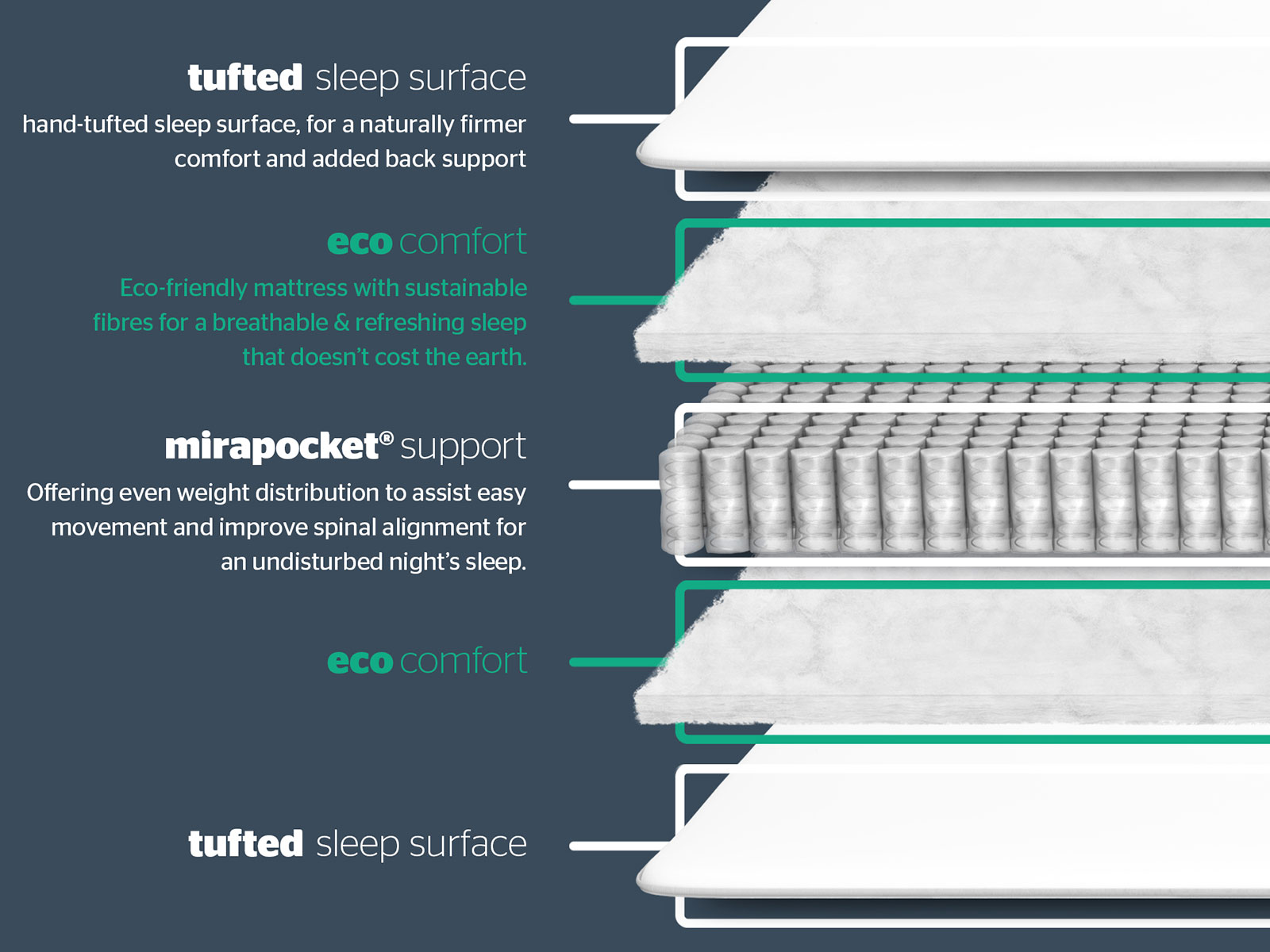 Teamed with a Mirapocket spring system to offer tailored support, as each spring is individually nested and reacts independently to the weight and movement of your body, providing even weight distribution and maximum sleeping space.