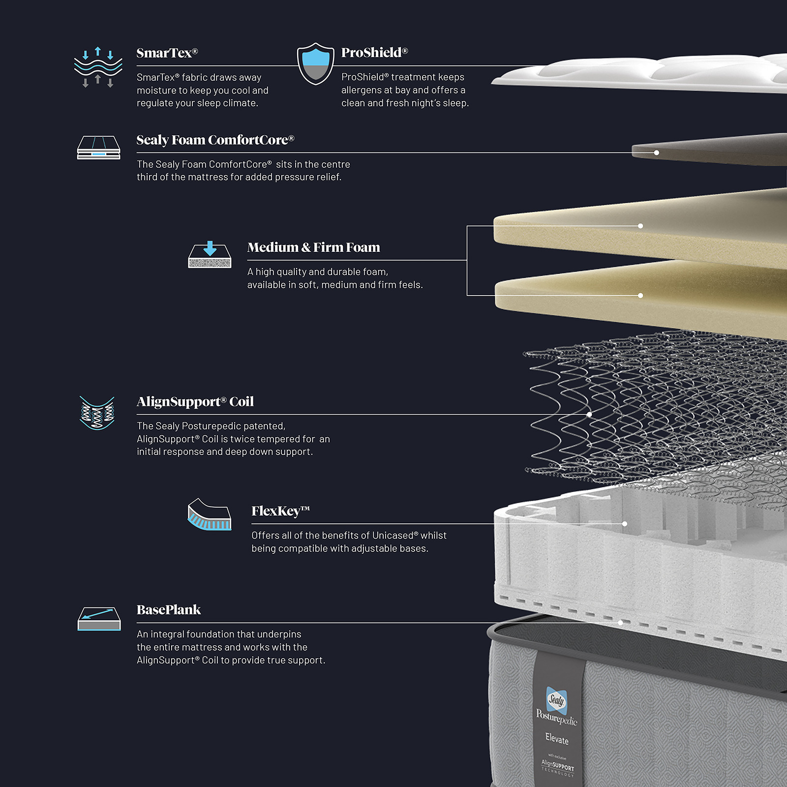 The Sealy Posturepedic Elevate Blake FLEX is a medium-feel mattress specifically designed for adjustable beds. Offering the perfect balance – not too firm, not too soft – it is a true crowd-pleaser that delivers genuine support, true comfort, and dependable durability night after night.
