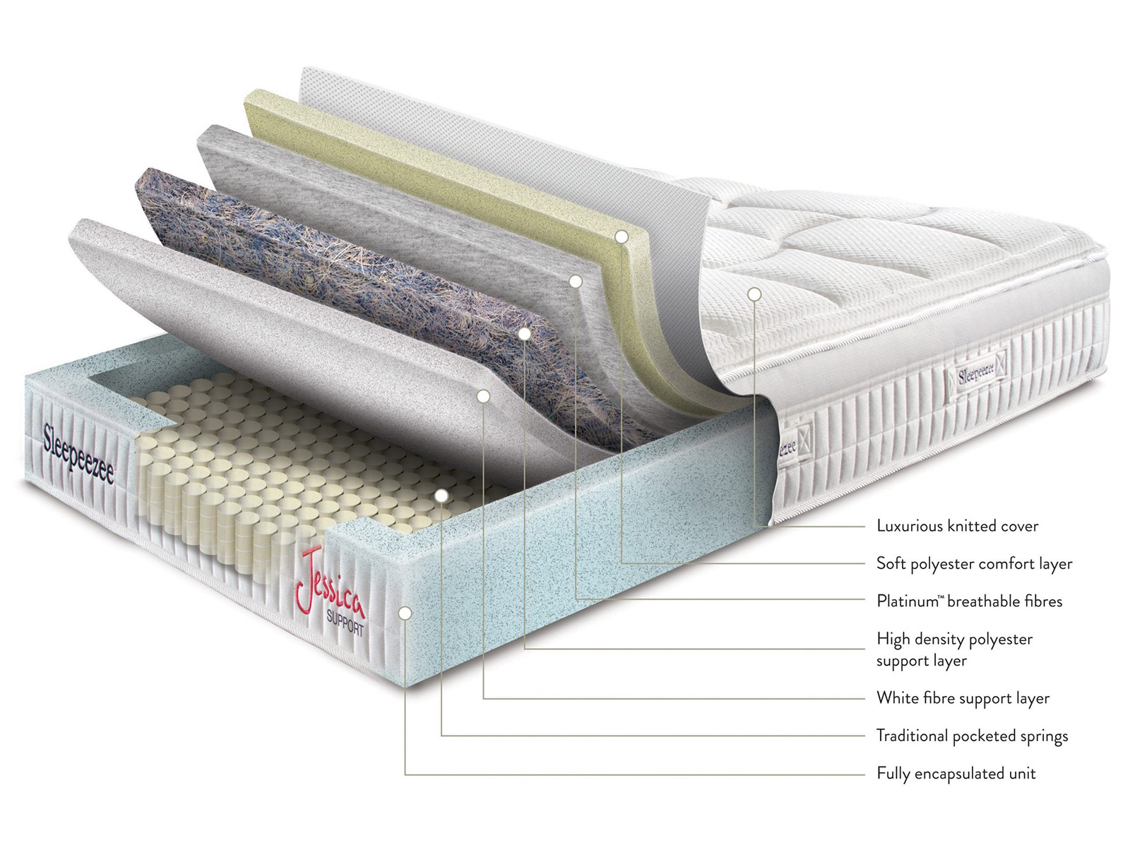 The Sleepeezee Jessica range of mattresses are handmade in the UK from the very finest British materials. Each mattress is handmade by Sleepeezee’s expert team at their factory in Kent and then shipped directly to retailers across the UK.