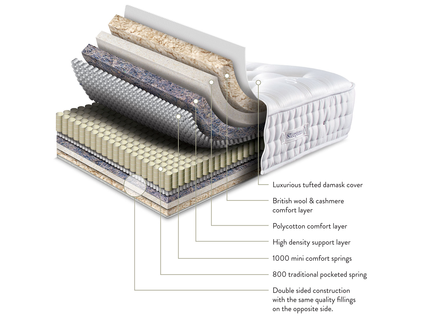 Natural, breathable and durable. The Wool Luxe 2800 double-sided mattress features luxurious layers of British wool and cashmere for superior temperature regulation throughout the seasons.
