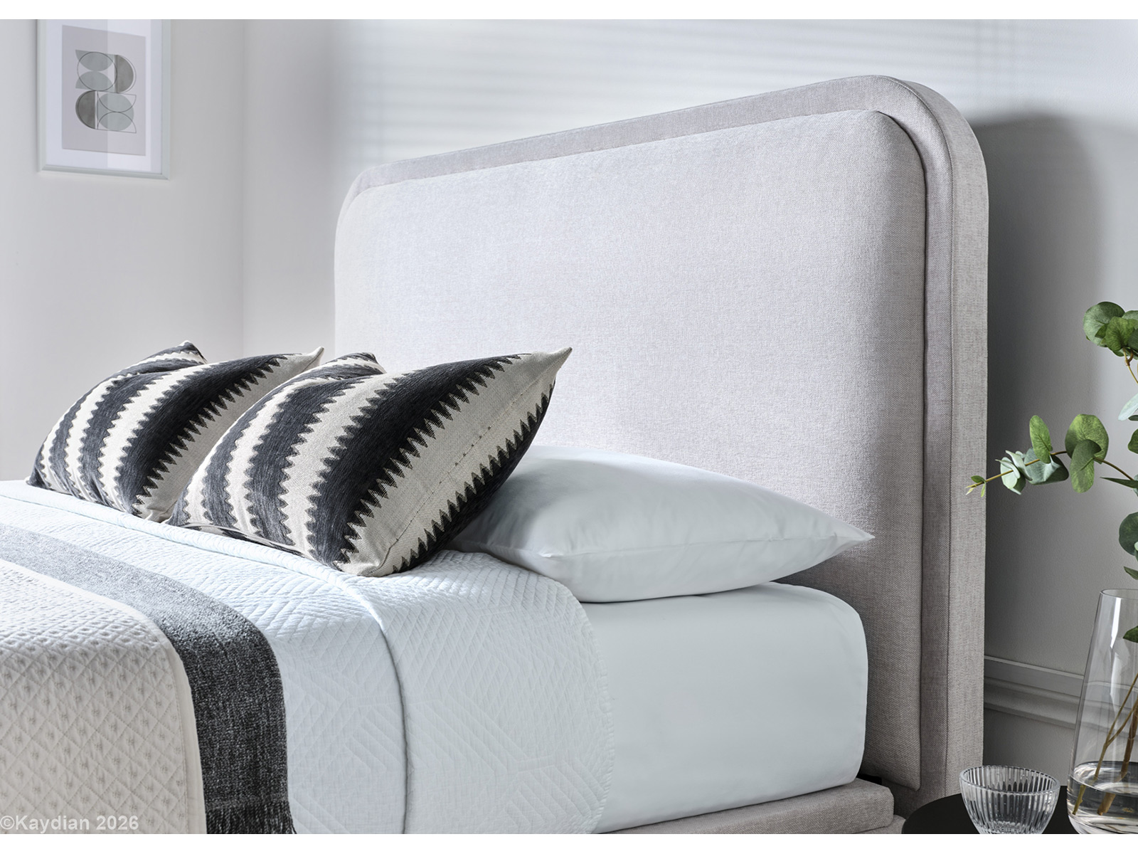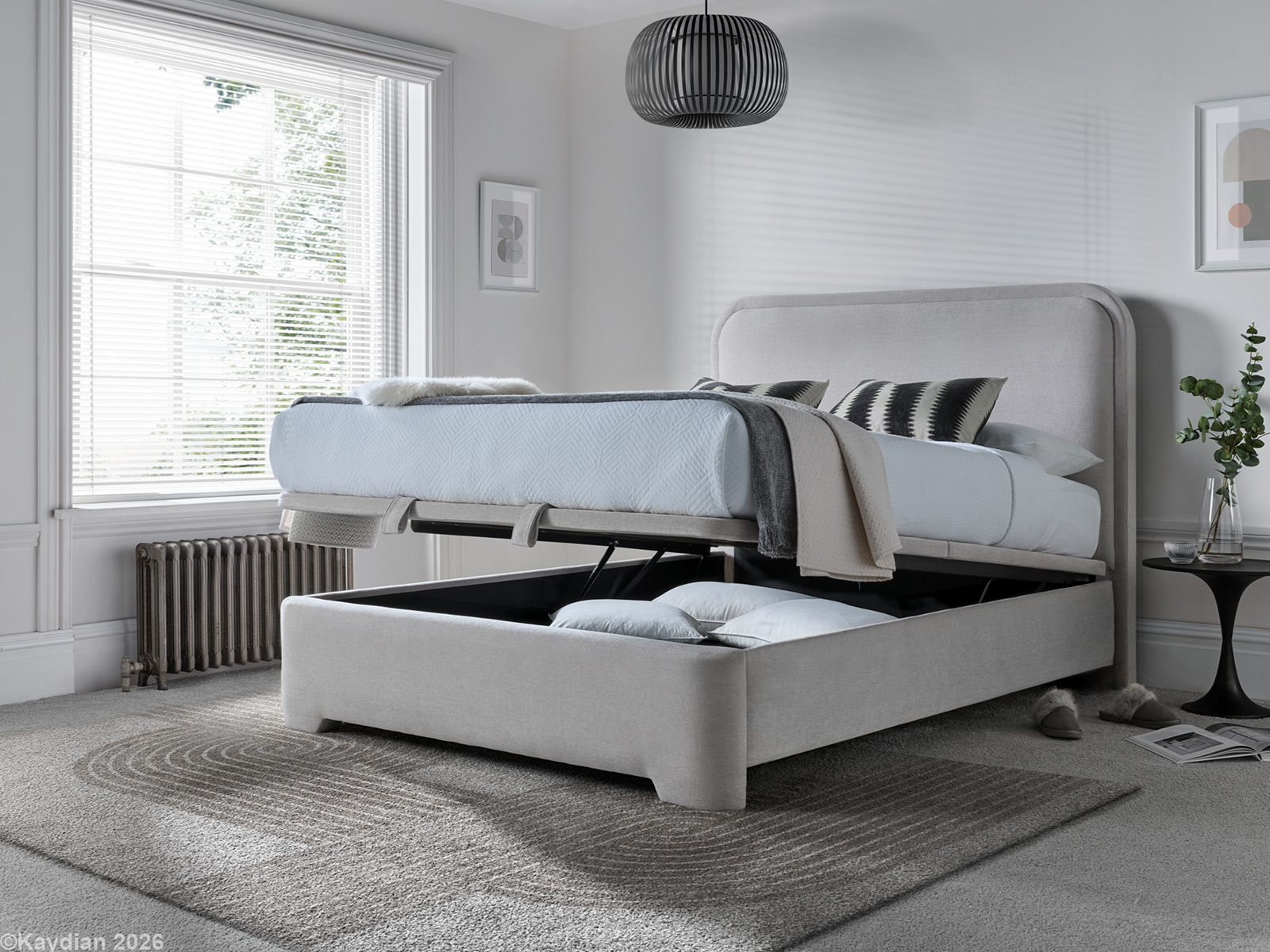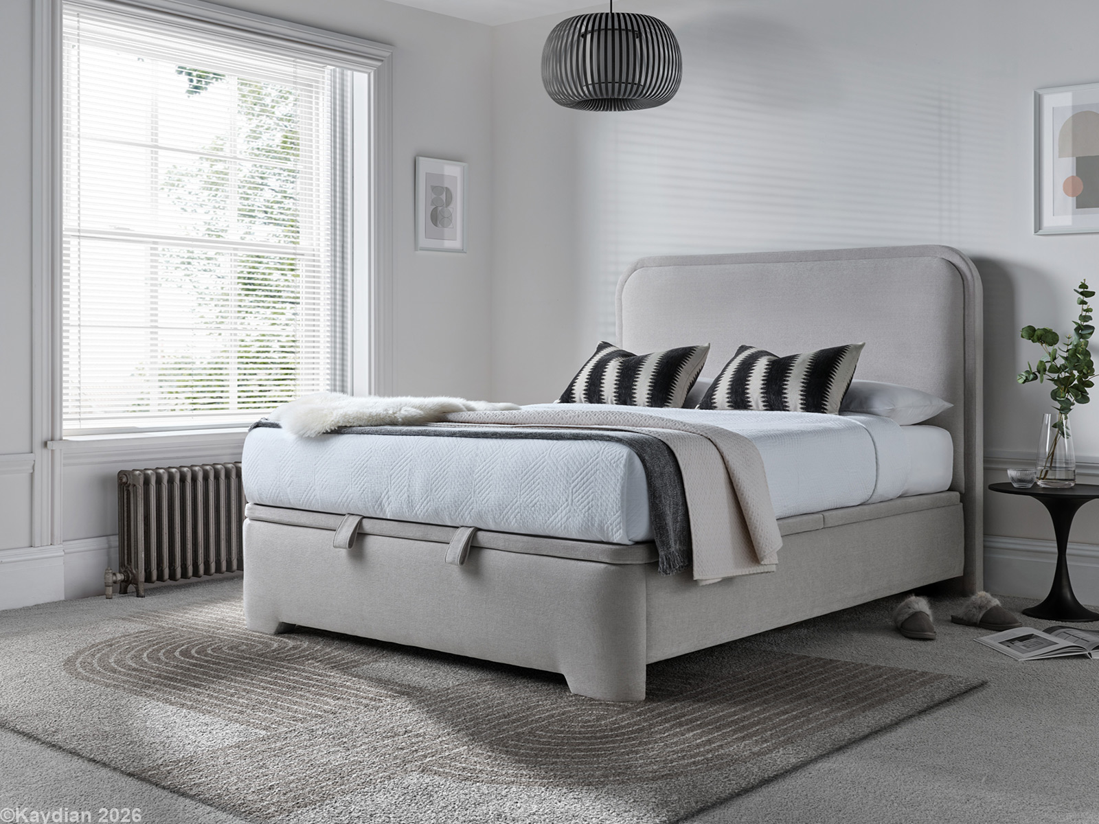 The Kaydian Clithroe Storage Ottoman Bed in Maskat Clay fabric effortlessly combines graceful curves with clever hidden storage, making it a stunning and practical addition to any contemporary or traditional bedroom.