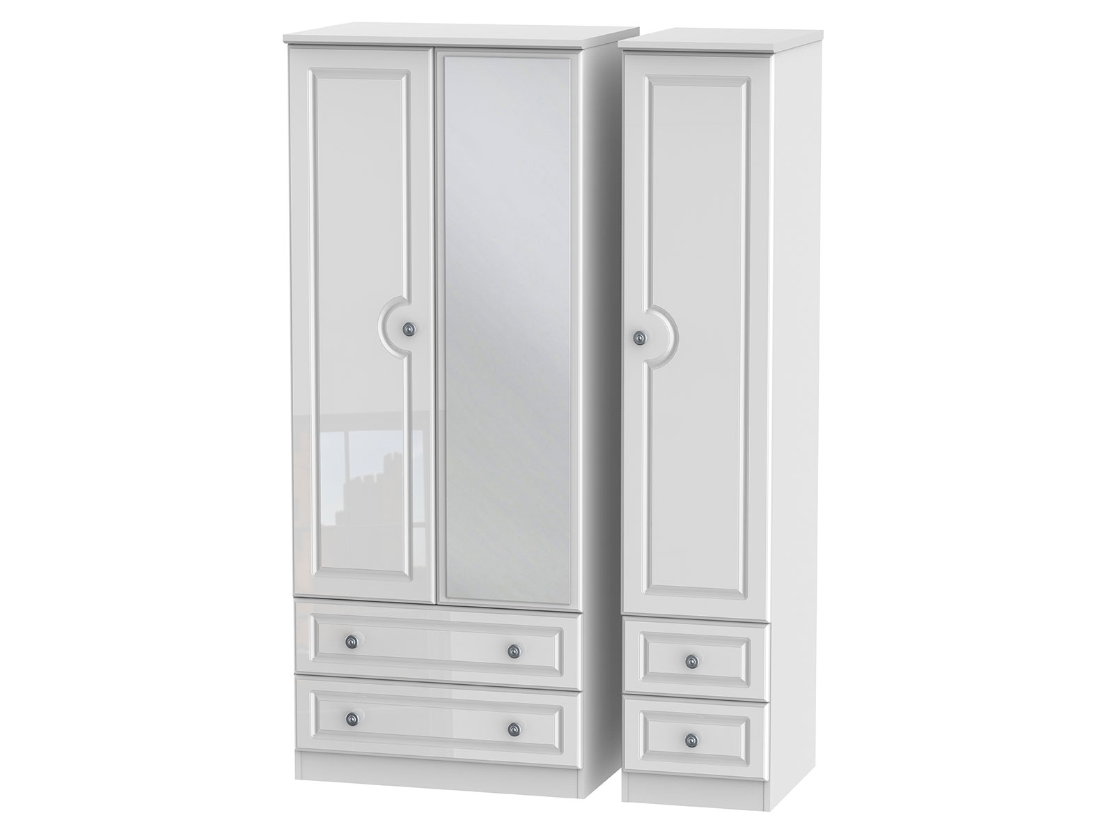 This full height triple 3 door wardrobeis perfect for any bedroom when a normal wardrobe is just not large enough. Also features 2 narrow and 2 wide storage drawers for added practicality as well as a single mirrored door.