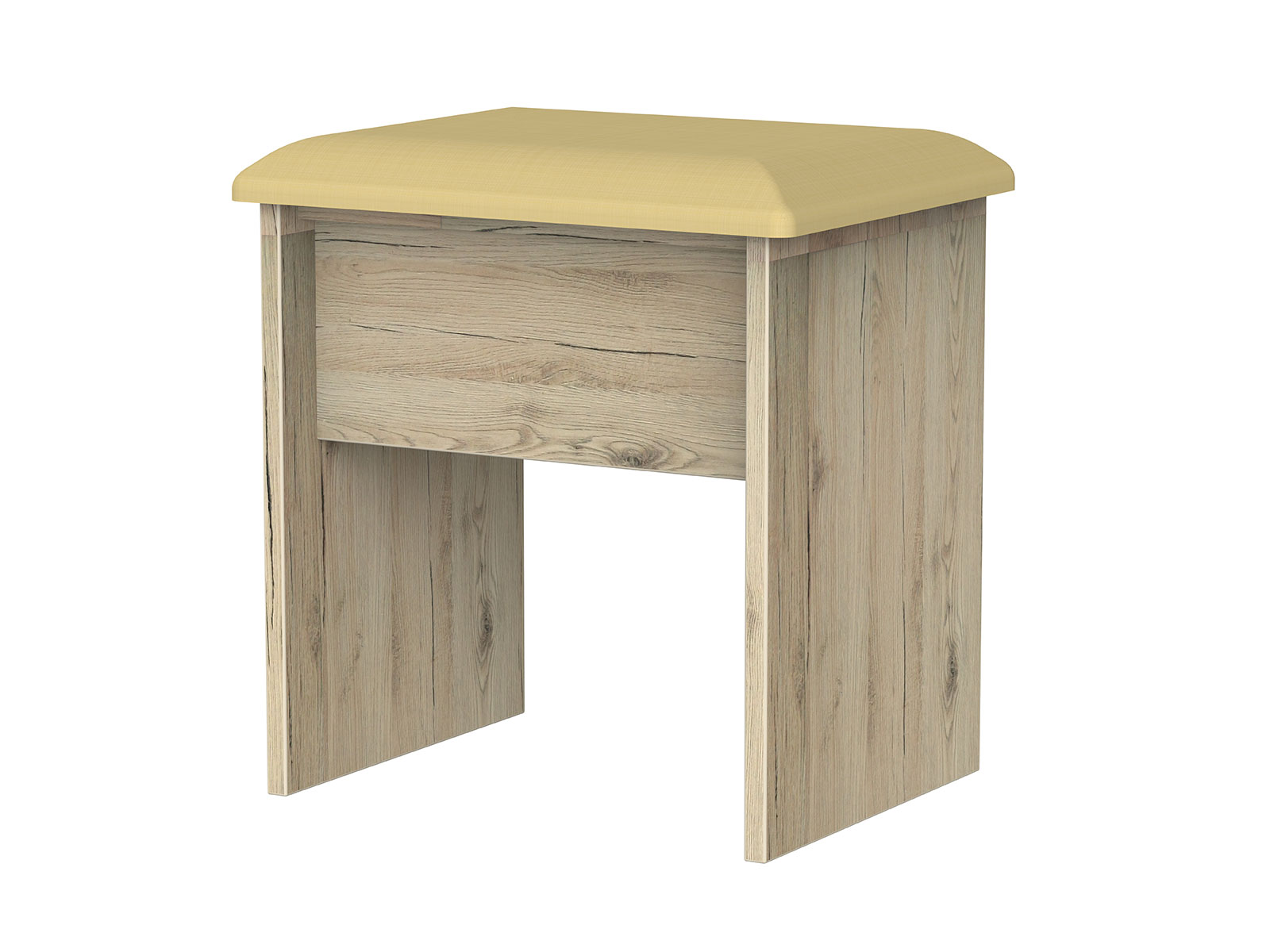 A small vanity stool. A light simple, yet sturdy design, with a soft cushioned seat. Makes an idea companion to a desk or vanity.