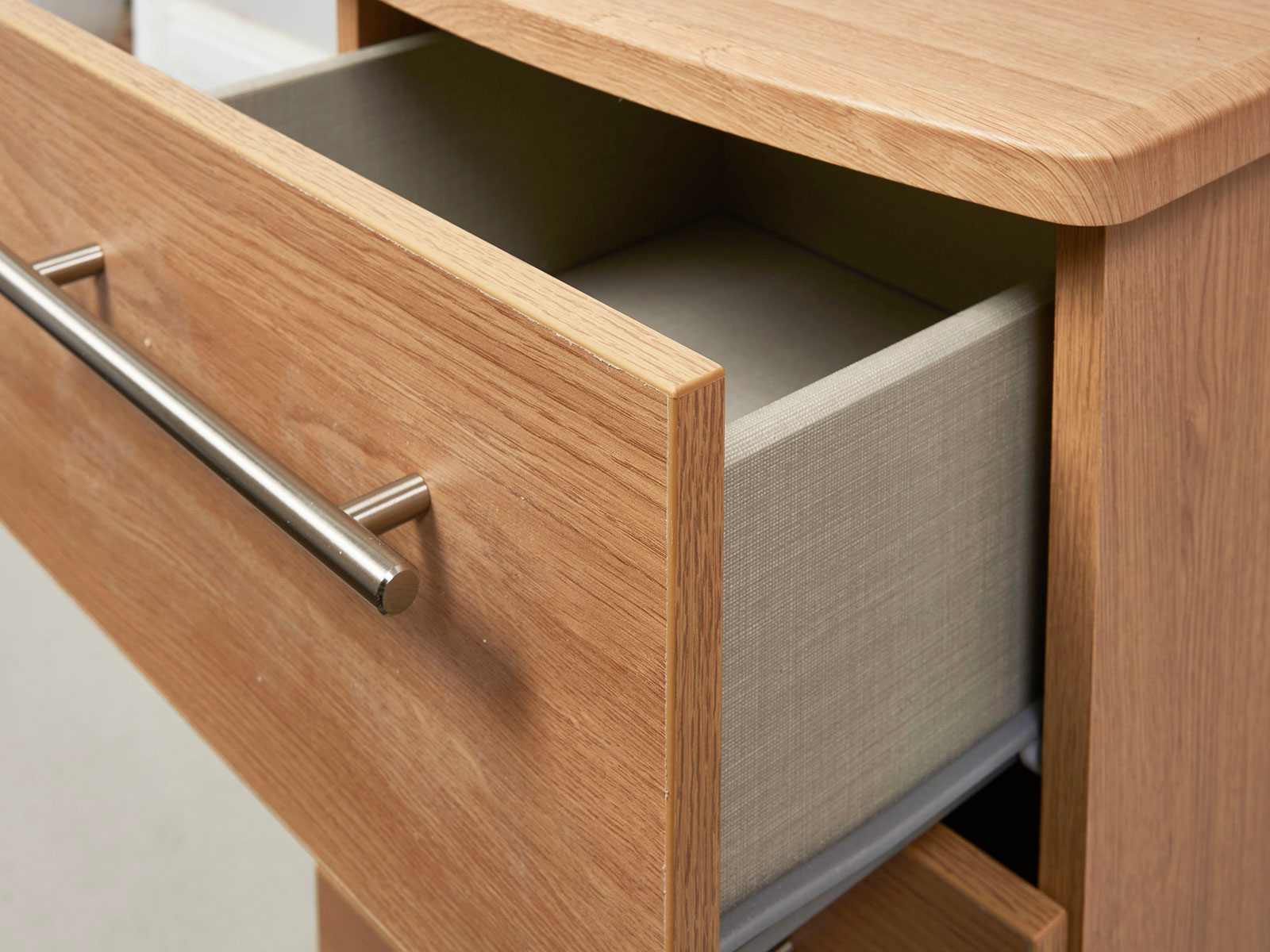 The elegant, stylish Sherwood range is available in a range of durable scratch resistant natural wood or matt finishes. With metal T-Bar handles on all doors and drawers. All drawers come with long lasting metal drawer runners and a linen effect interior.