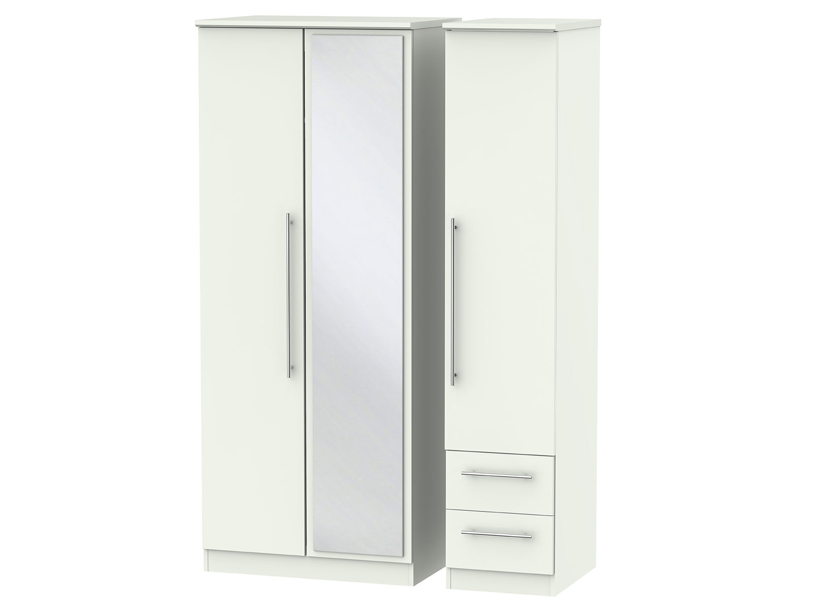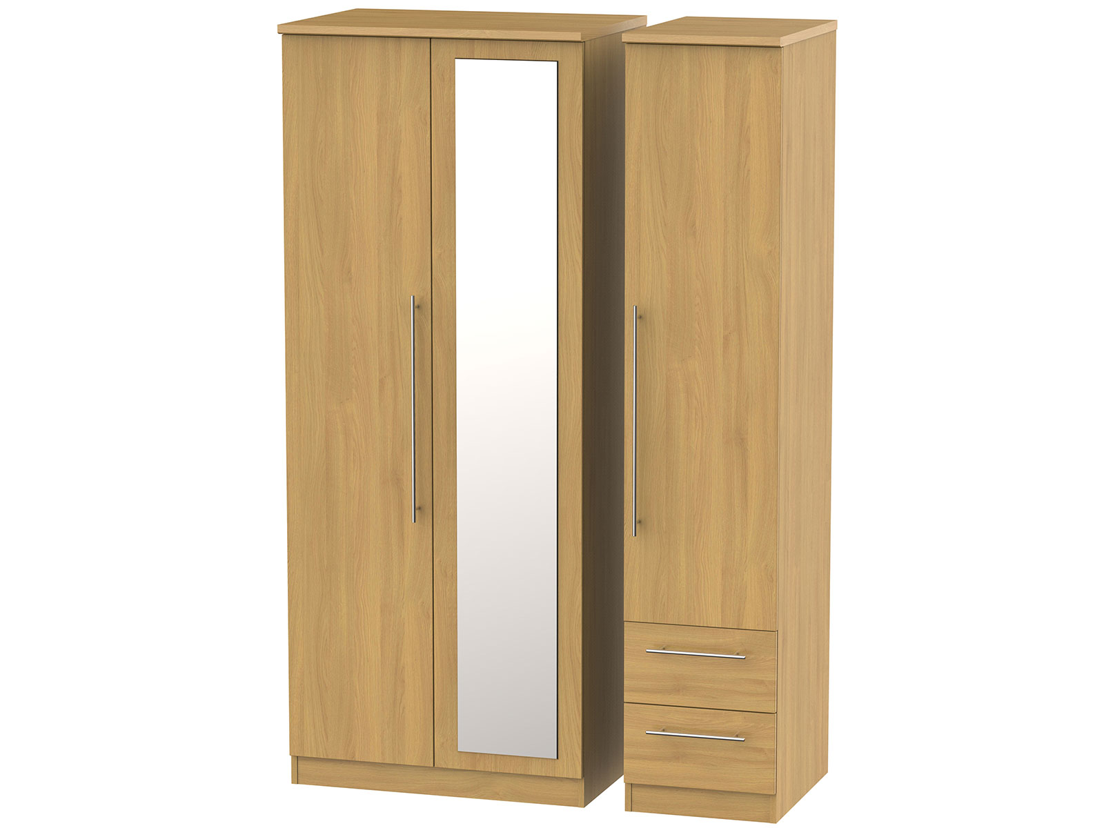 This full height triple 3 door wardrobeis perfect for any bedroom when a normal wardrobe is just not large enough. Also features 2 narrow storage drawers for added practicality and a single full height mirrored door.